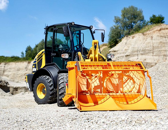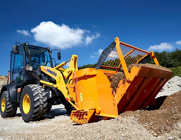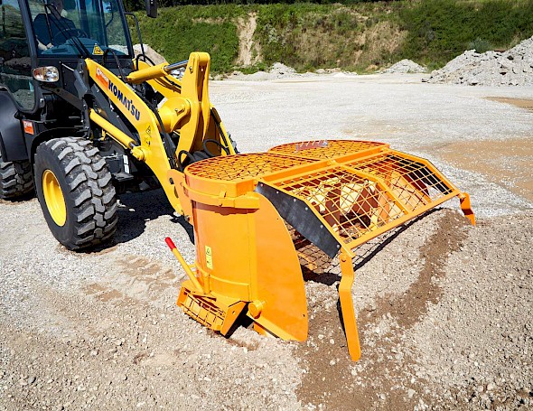 Einfach in den Kies, Schotterhaufen etc. einfahren,die Schaufel schließen und die Zusatzkomponenten hinzugeben