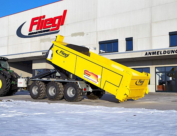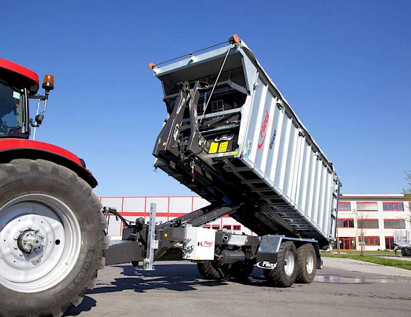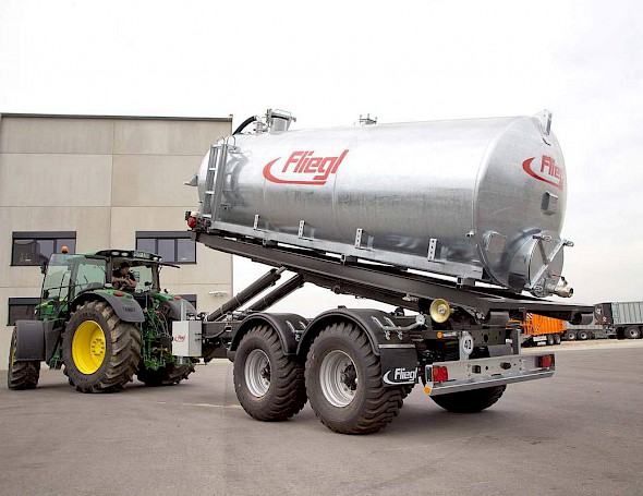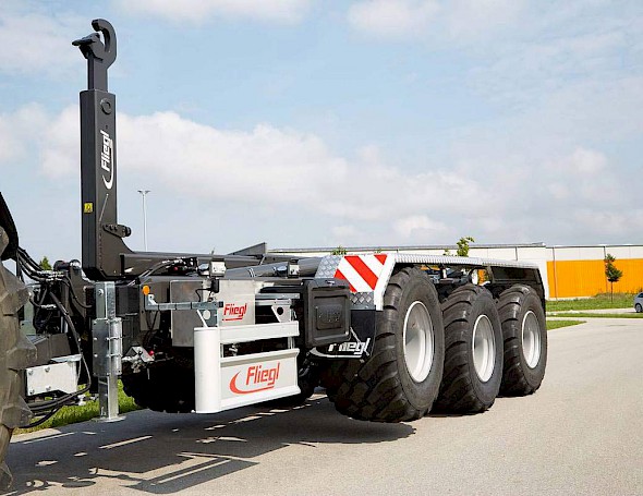 Stabil, flexibel, effizient: das Fliegl Hakenlift-System macht Tandem und Tridem-Abrollkipper zu Transport-Allroundern. Mit nur einem Hakenlift-Fahrgestell können Container, zum Beispiel original Fliegl Abschiebecontainer, Mulden, Plattformen und selbst voluminöse Güllefässer transportiert werden. Der Fliegl-Hakenlift ist besonders praktisch, wenn Container stationär befüllt werden müssen.