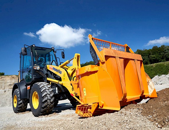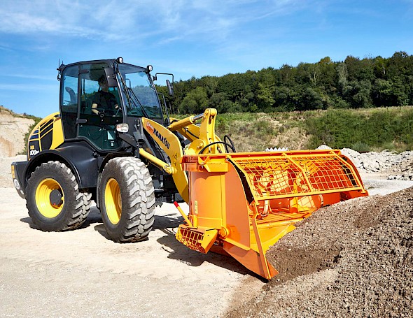 Einfach in den Kies, Schotterhaufen etc. einfahren,die Schaufel schließen und die Zusatzkomponenten hinzugeben