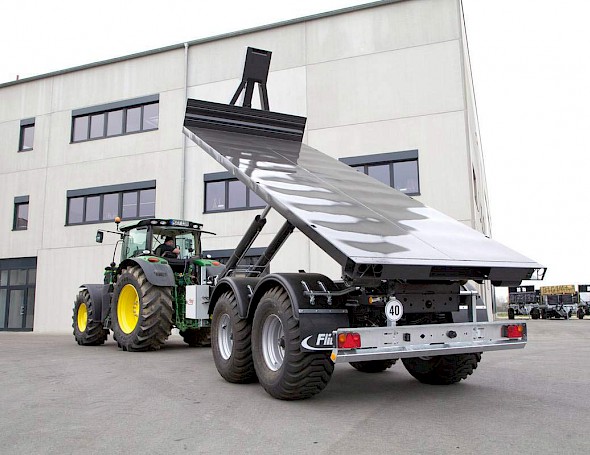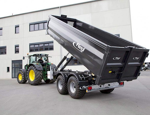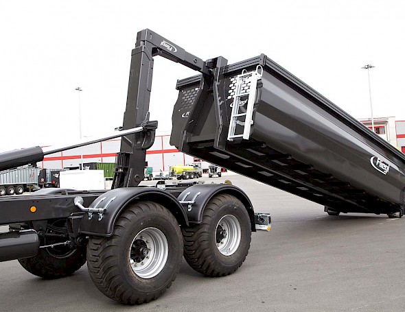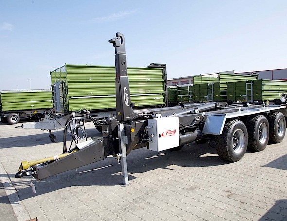Stabil, flexibel, effizient: das Fliegl Hakenlift-System macht Tandem und Tridem-Abrollkipper zu Transport-Allroundern. Mit nur einem Hakenlift-Fahrgestell können Container, zum Beispiel original Fliegl Abschiebecontainer, Mulden, Plattformen und selbst voluminöse Güllefässer transportiert werden. Der Fliegl-Hakenlift ist besonders praktisch, wenn Container stationär befüllt werden müssen.